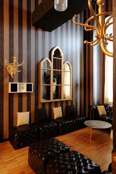 All'interno dell'ampio locale delle travi a vista sormontano il soffitto. L'arredamento particolarissimo, è costituito da divani ricoperti in damasco e tavoli rivestiti in maiolica che danno all'ambiente un appeal molto suggestivo.
